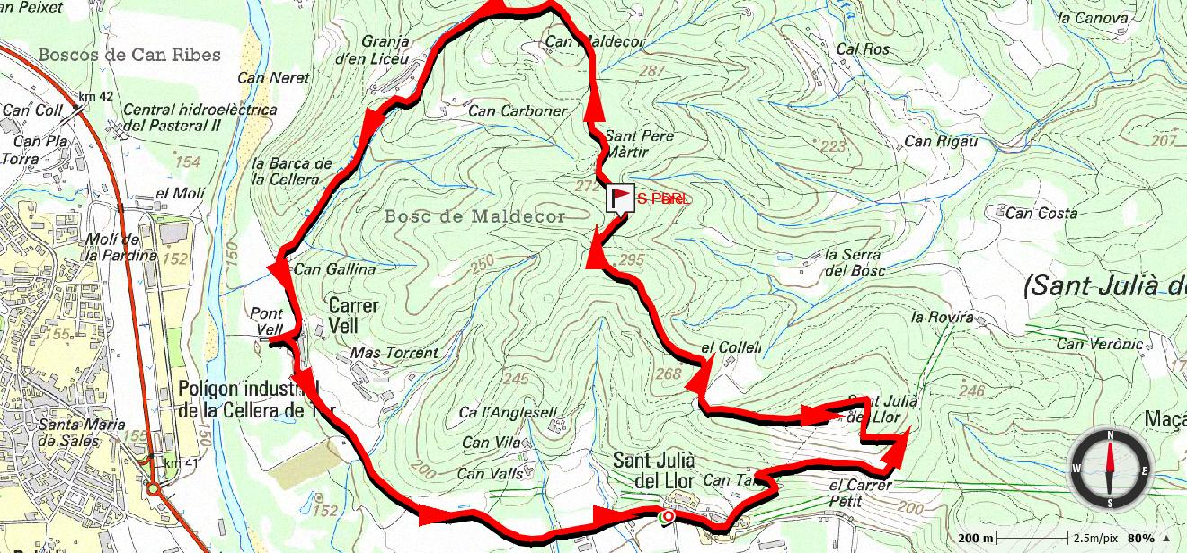 Baixem cap a S. Andreu de Porreres i decidim de continuar anant seguint camí més de pista cap al oest, deixant durant aquest tram la traça que portava. Fem cap al Collet de Creuers i des de aquí pugem per un camí semi-perdut passant el Collet de l'Empriu per anar a retrobar la traça gps. La seguim un bon tram, fins que, arribats al torrent dels Sunyers, ja es complica totalment seguir cap rastre. El terra es tapat de fulles i hem d'anar provant de trobar rastre de camí, per diferents llocs, fins que quan ja comencem a pensar en retrocedir per anar a buscar altres sortides, trobem el rastre bo, que ens porta cap al Escaler de les Trevinedes i en acabar la pujada, decidim d'anar a buscar sortida a la carretera asfaltada que es veu a baix a la vall. Baixem pel costat de la casa l'Apallador i anem a sortir a la carretera de la Vall del Bac, on ens ve a buscar el bus.
